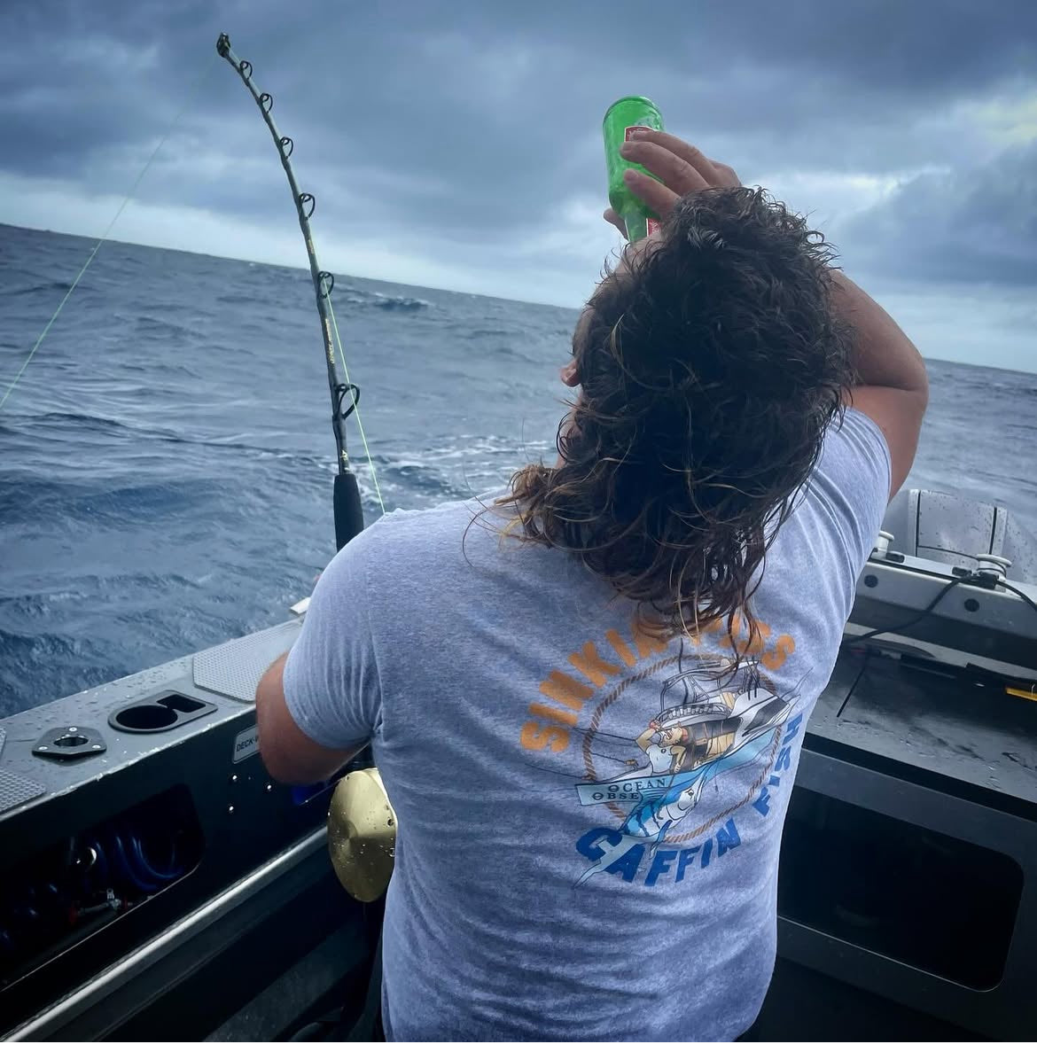 EX DISPLAY tees! We are having a warehouse clean out and have limited stock! Don’t miss our sale! Men’s grey Sinkin Piss, Gaffin Fish ~